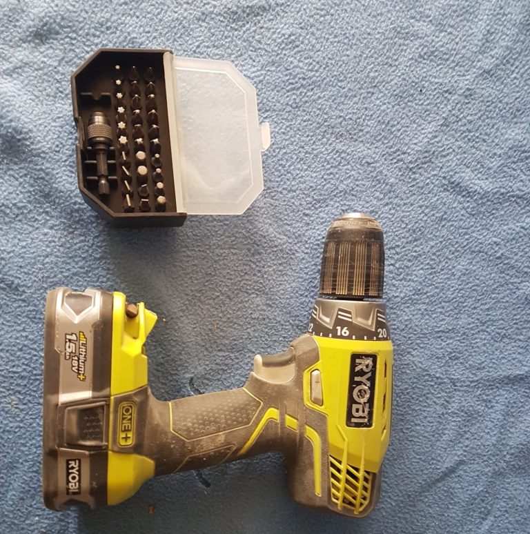 Akkuschrauber, Bits und Bohrer in verschiedenen Größen erleichtert das Öffnen von Verschraubungen ungemein.